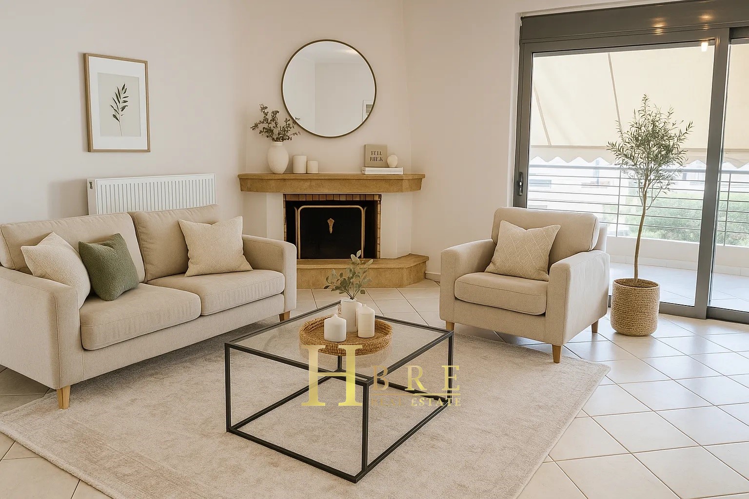 Η μεζονέτα ξεχωρίζει για τον διαμπερή σχεδιασμό της και την ανοιχτή θέα στη θάλασσα, προσφέροντας υψηλή ποιότητα διαβίωσης.