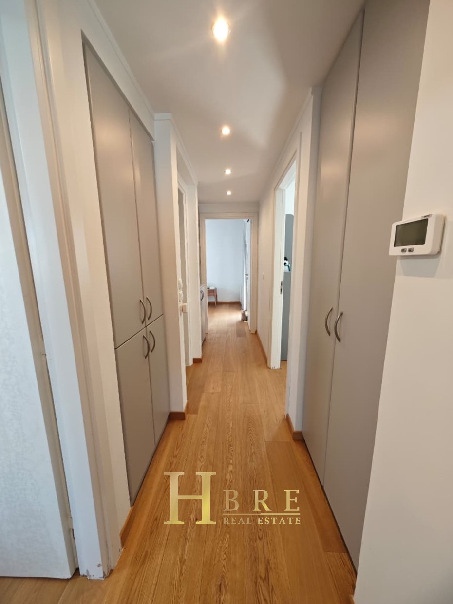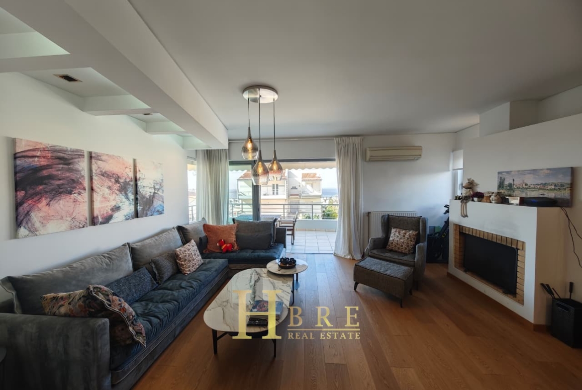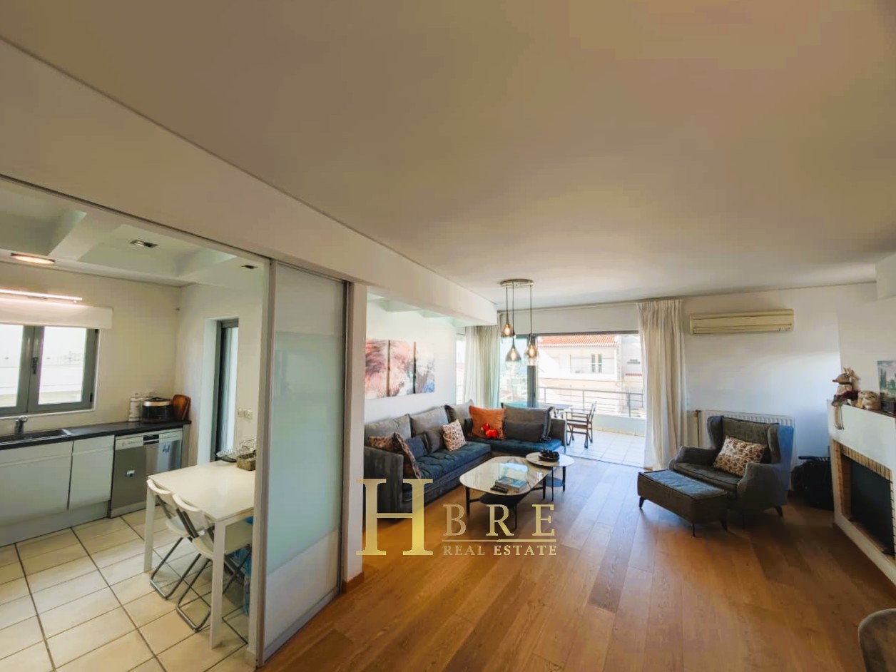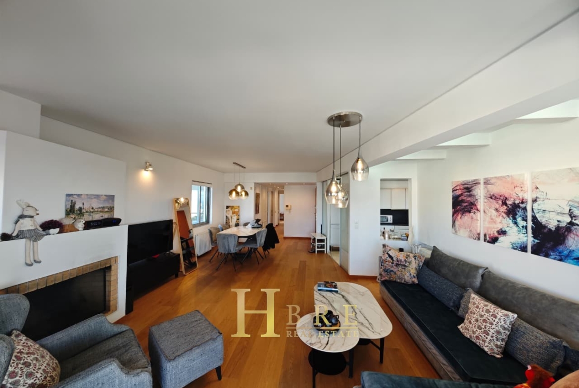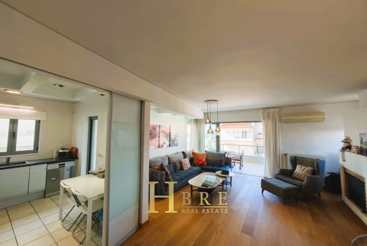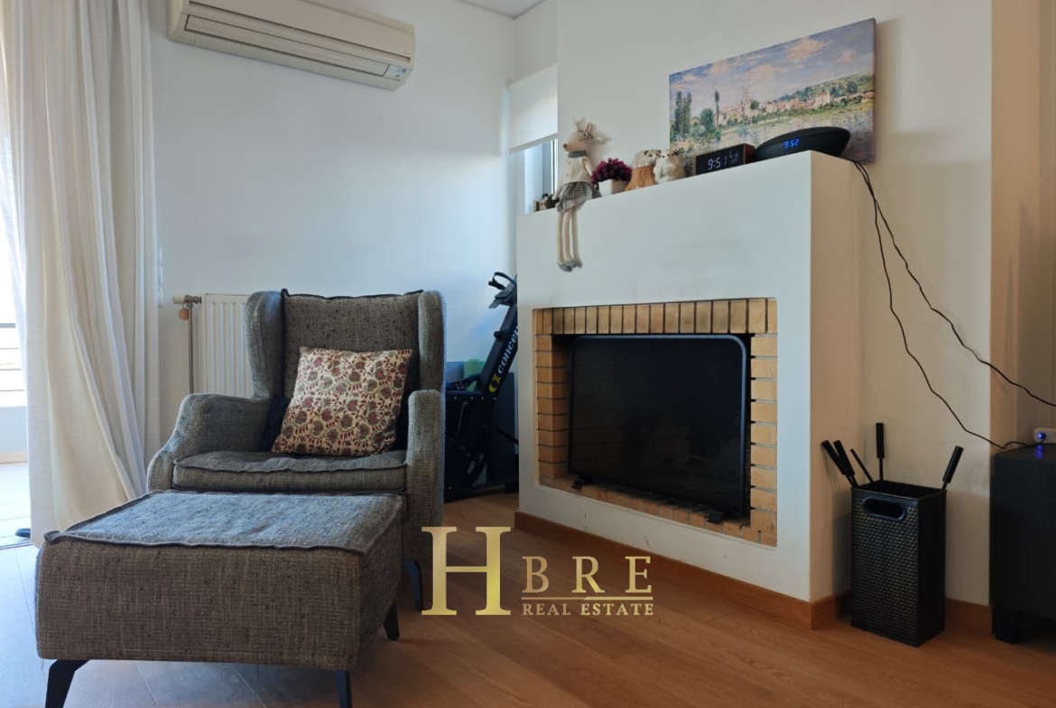 Ο χώρος υποδοχής είναι ιδιαίτερα ευρύχωρος και φωτεινός, με άνετο σαλόνι που διαθέτει τζάκι και ξεχωριστό χώρο τραπεζαρίας, ιδανικό για καθημερινή διαβίωση αλλά και φιλοξενία. Η κουζίνα είναι μοντέρνα και πλήρως εξοπλισμένη, σχεδιασμένη με έμφαση στην εργονομία. Το διαμέρισμα περιλαμβάνει 3 άνετα υπνοδωμάτια, 1 πλήρες μπάνιο και 1 επιπλέον WC.