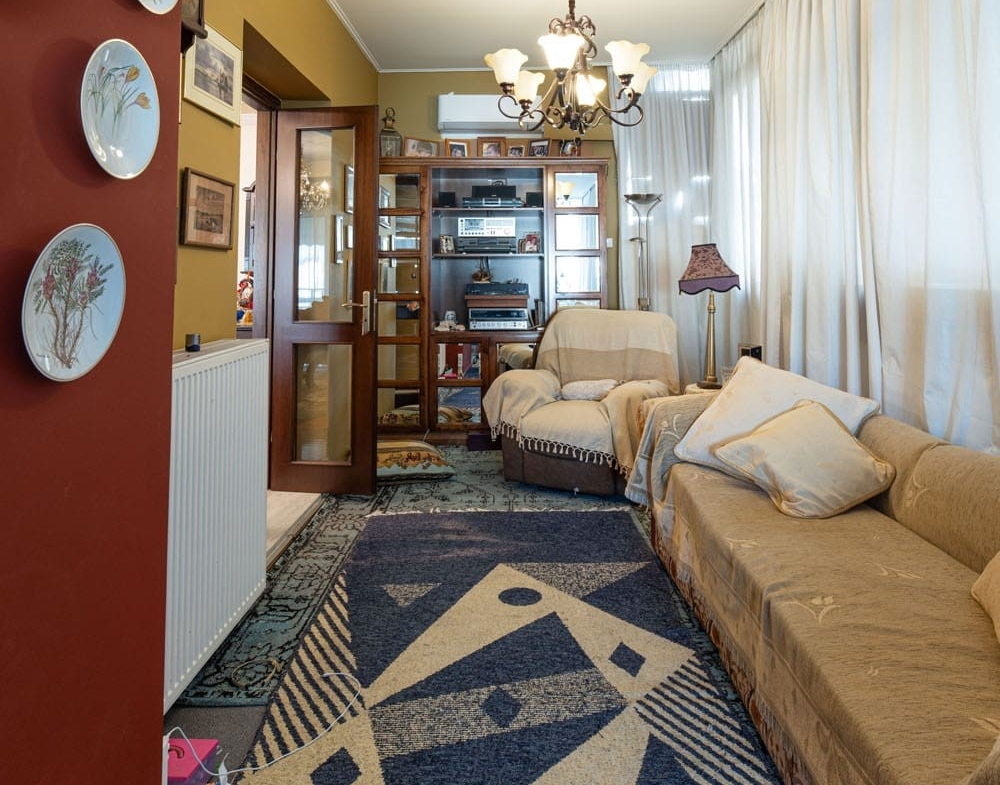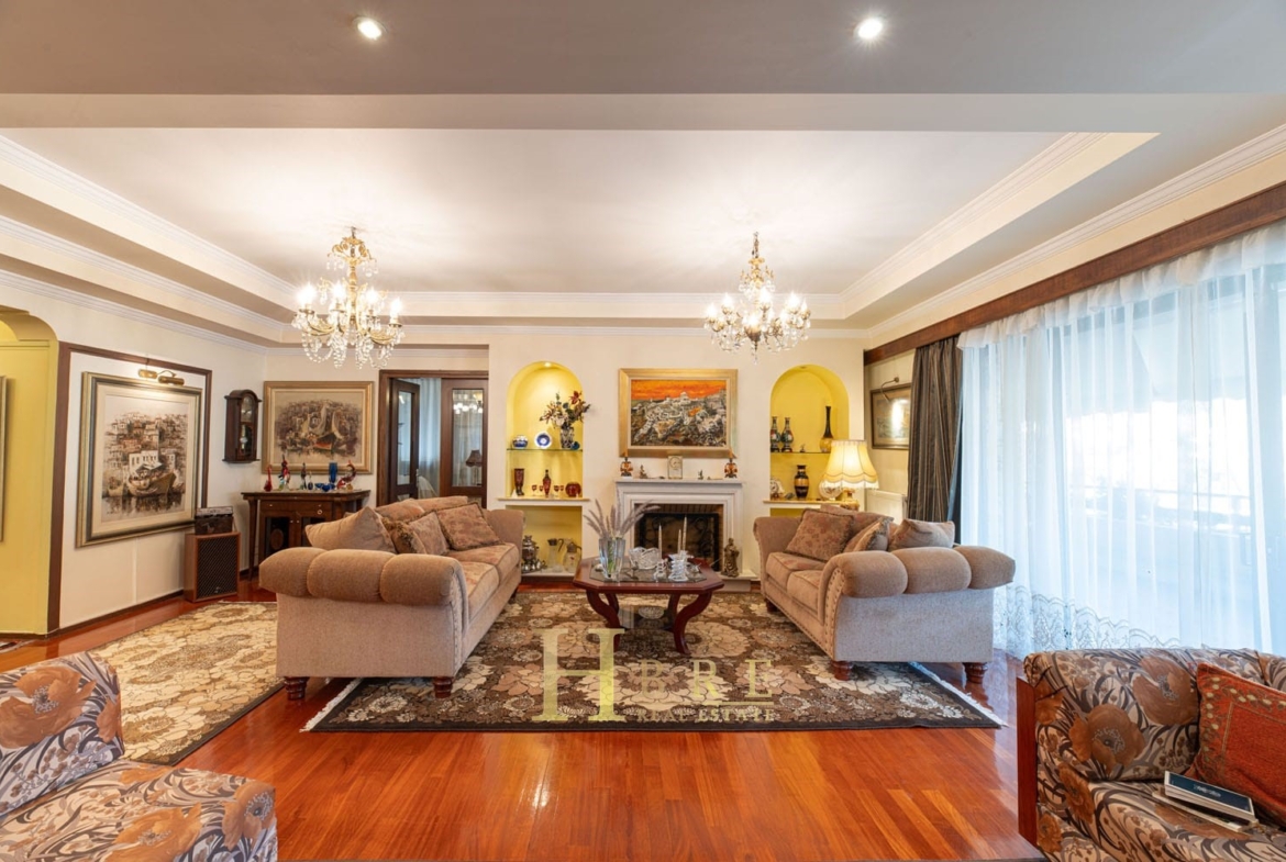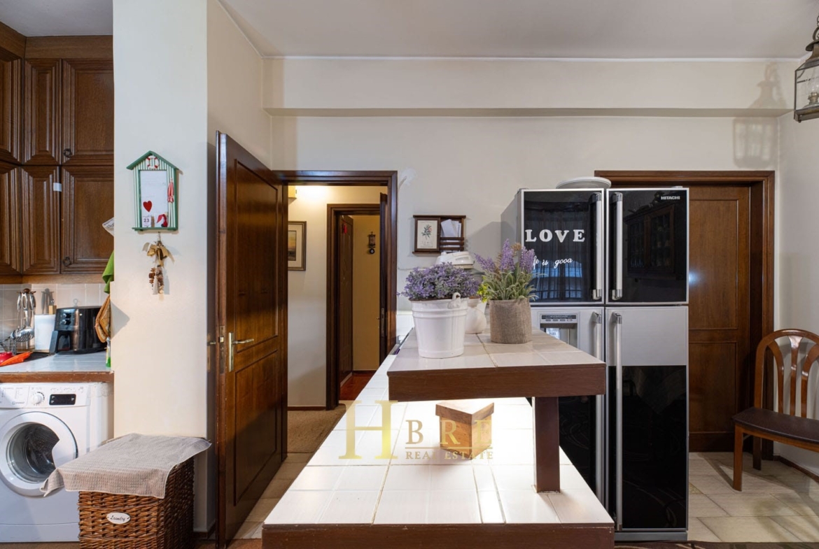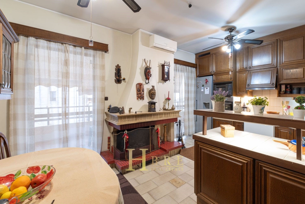 Το διαμέρισμα διαθέτει έναν ιδιαίτερα ευρύχωρο και φωτεινό χώρο σαλονιού με τζάκι, ιδανικό για στιγμές χαλάρωσης και φιλοξενίας. Η ανεξάρτητη κουζίνα είναι επίσης μεγάλη και λειτουργική, με δικό της τζάκι, προσφέροντας έναν ζεστό και φιλόξενο χώρο για την καθημερινότητα. Στο ιδιωτικό τμήμα της κατοικίας συναντάμε 3 άνετα υπνοδωμάτια, εκ των οποίων το ένα είναι master, ενώ συνολικά υπάρχουν 2 μπάνια και 1 επιπλέον WC.