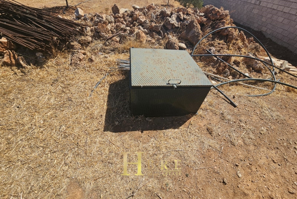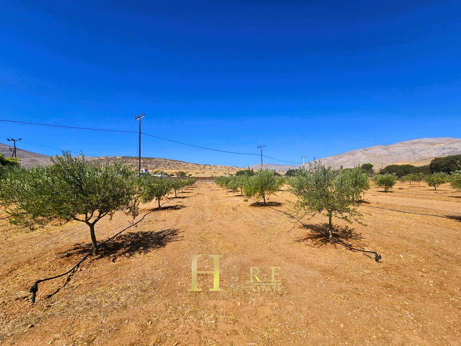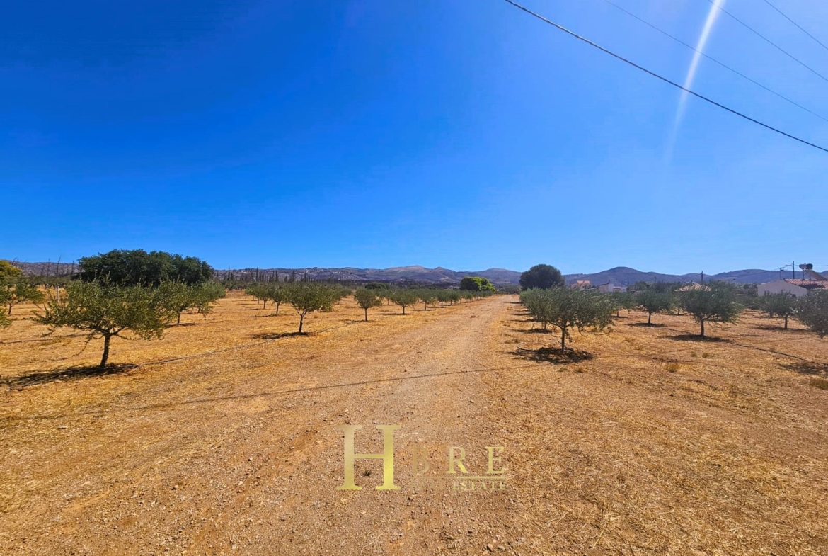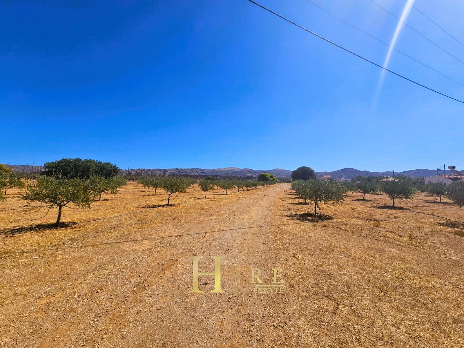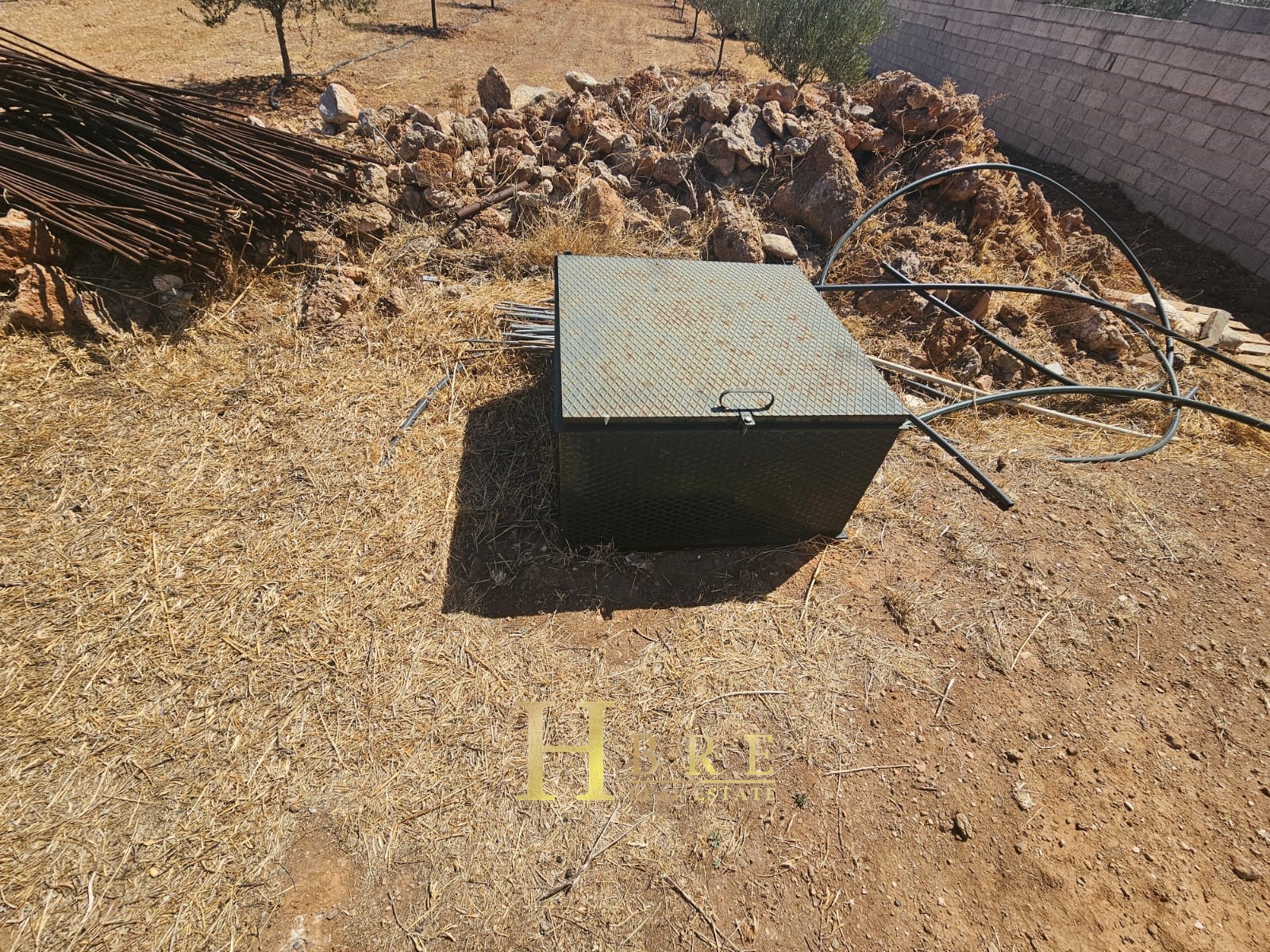 The property is flat, and easily accessible, with frontage on two roads, providing convenient access and flexibility for development. It is fenced and features a water well, while the land is planted with 500 productive olive trees, adding significant agricultural value.