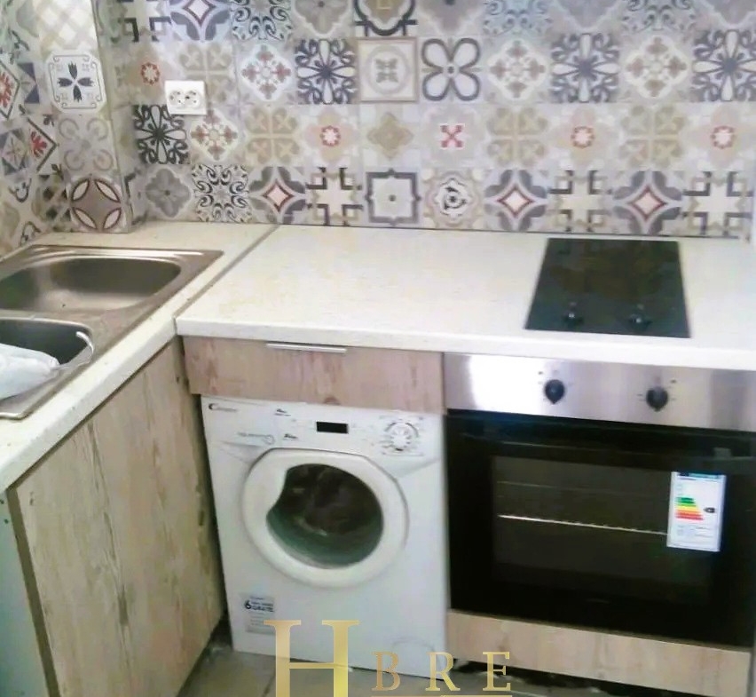 The interior layout consists of 1 bedroom with a large built-in wardrobe, a hall, an independent kitchen, and 1 bathroom. The property is equipped with a new air conditioning unit, a television, new kitchen appliances, and a water heater. The building offers elevator access, while monthly common expenses are approximately €20.