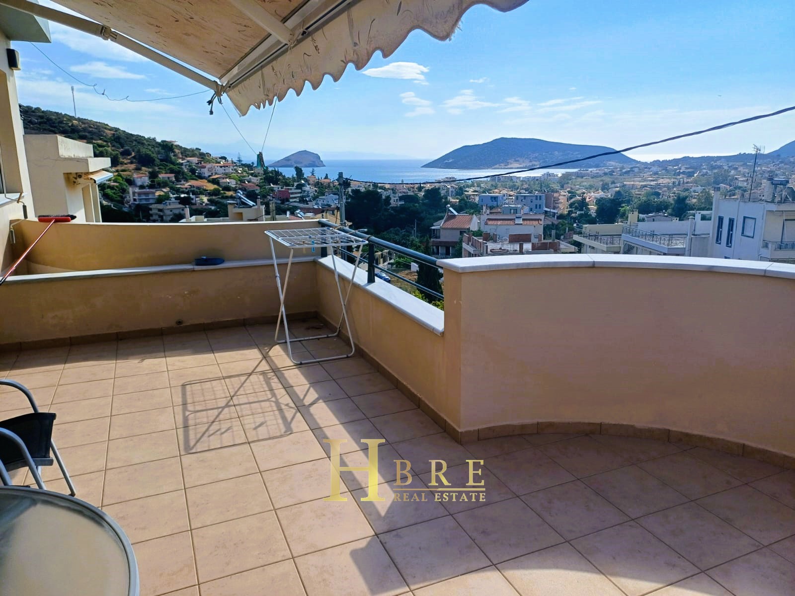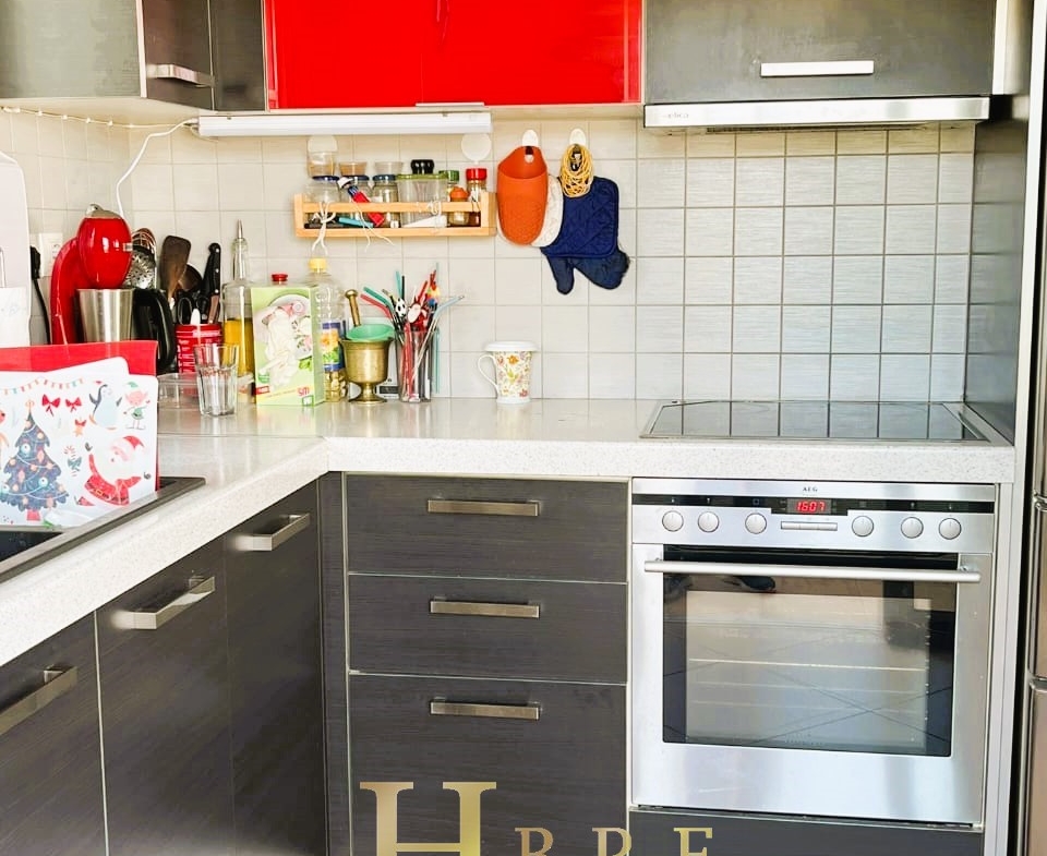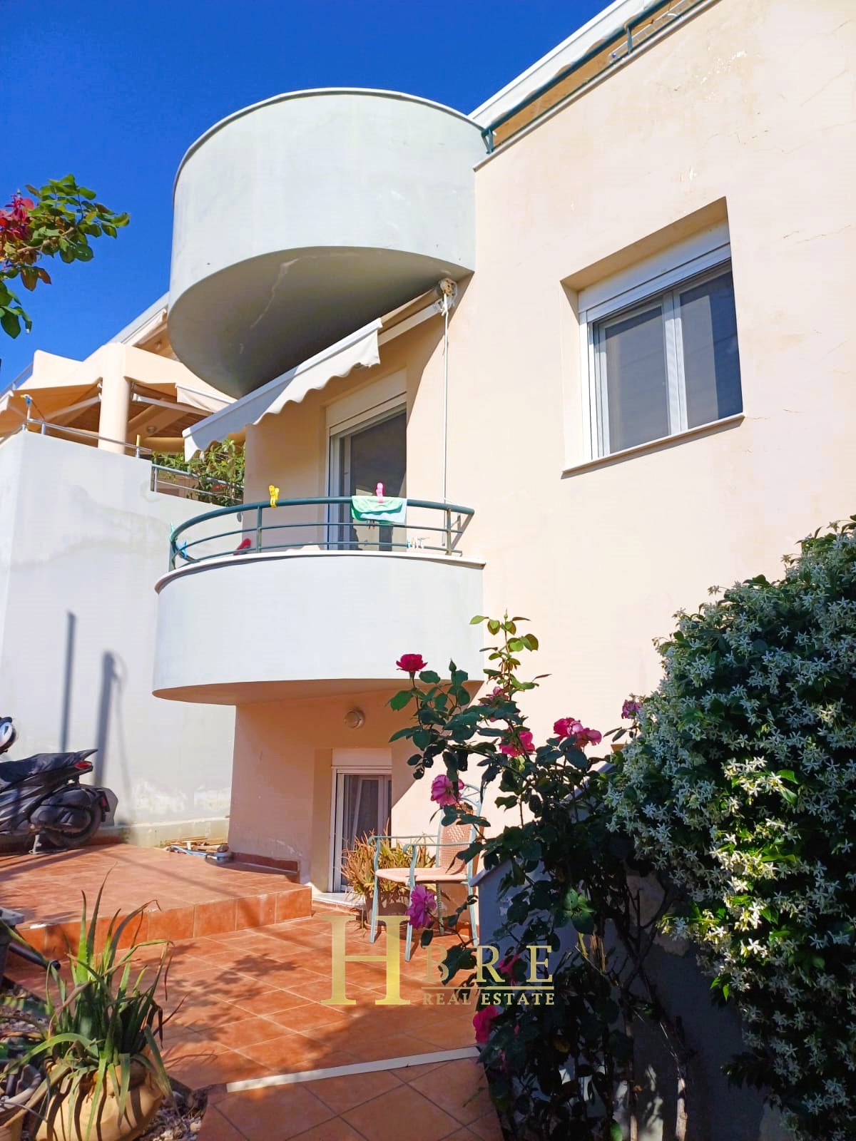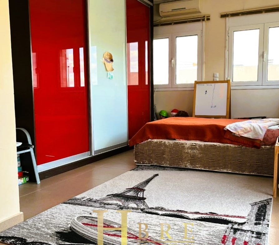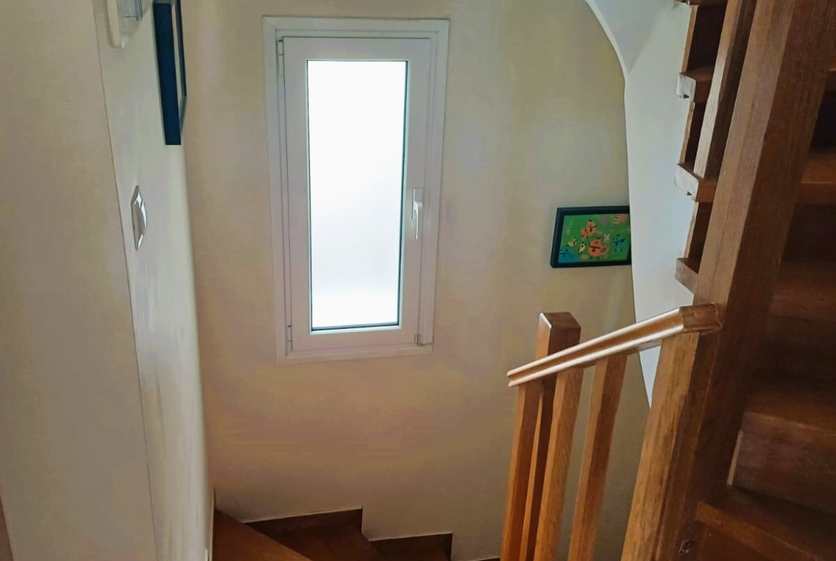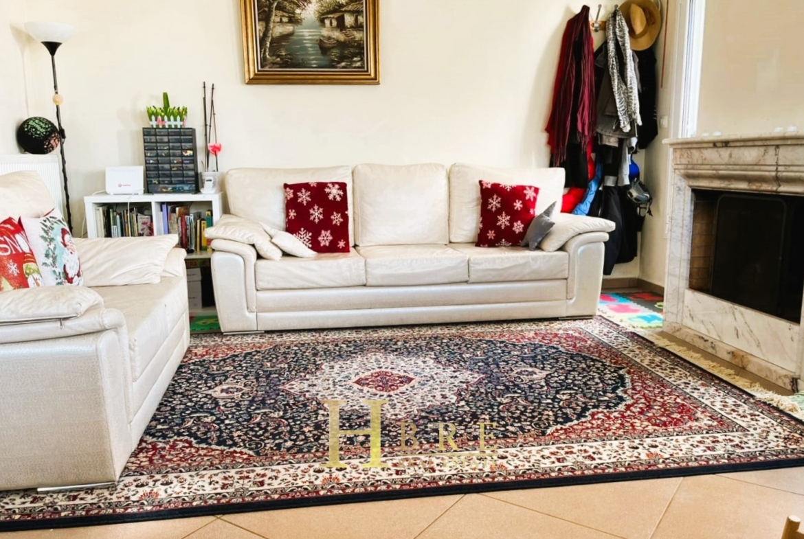 On the raised ground floor there is the living room with fireplace, an open modern kitchen, 1 guest wc and balconies, on the lower level there are 2 spacious bedrooms and 1 bathroom, and on the top level is the attic which is used as a 3rd bedroom, 1 bathroom and is connected to a large terrace and has a sea view.