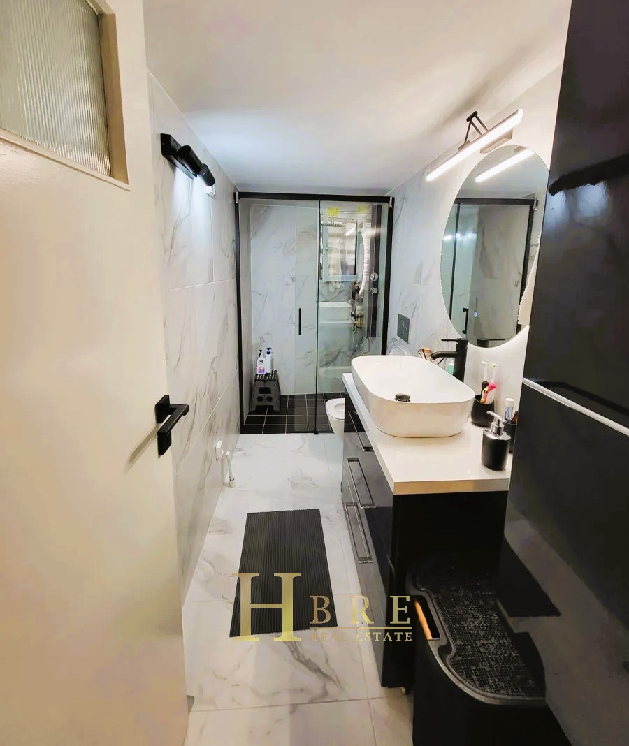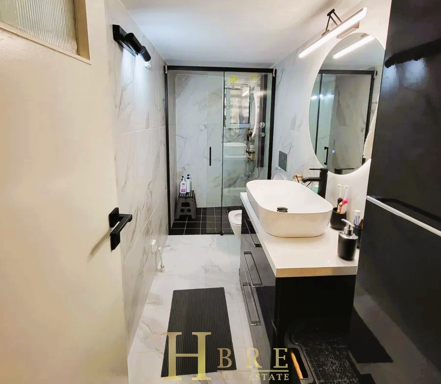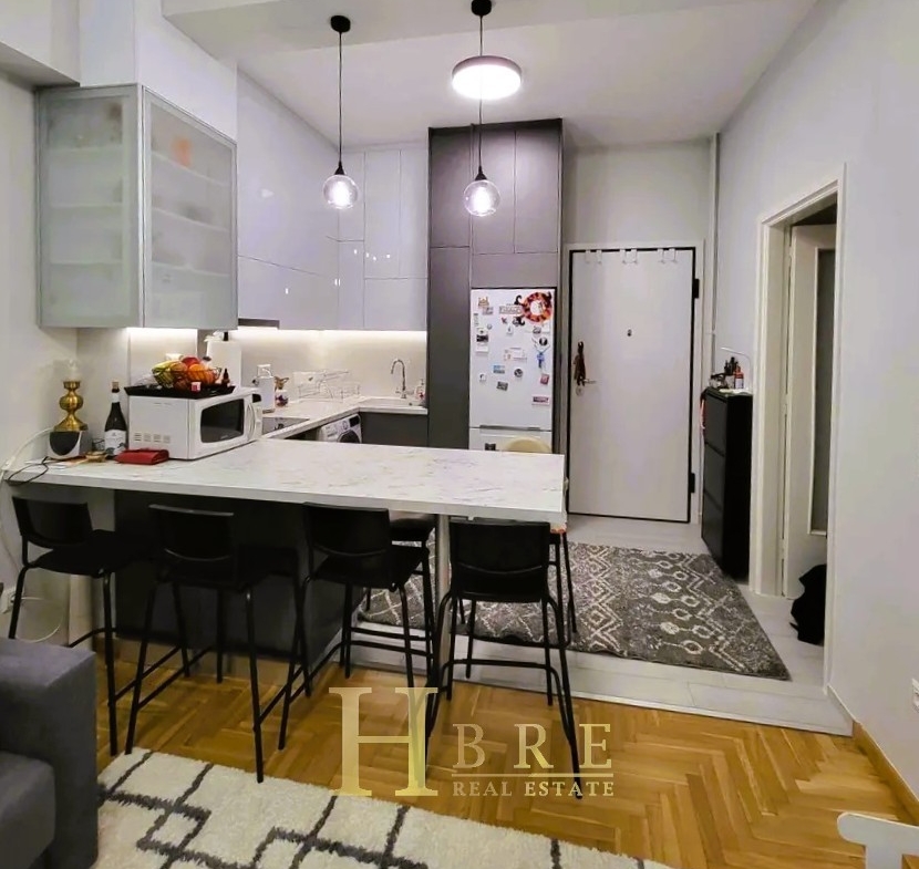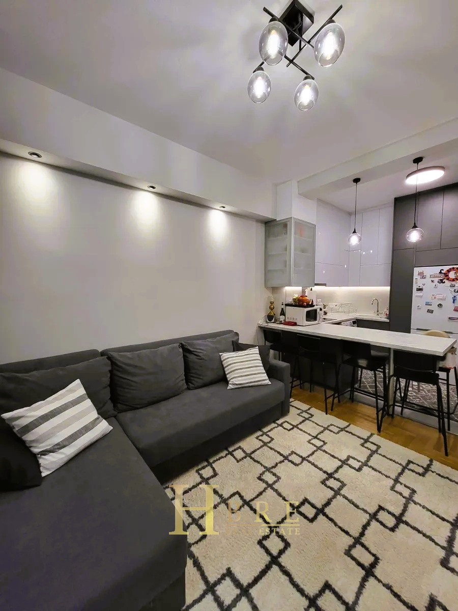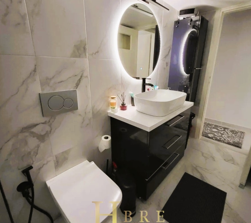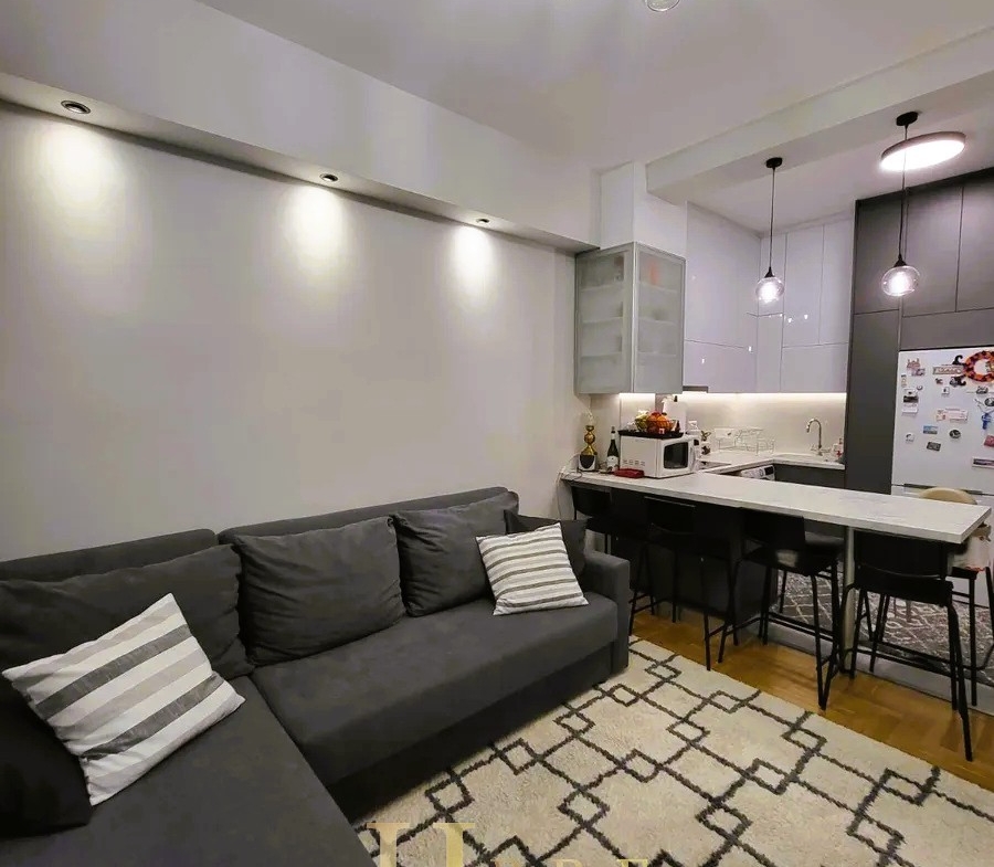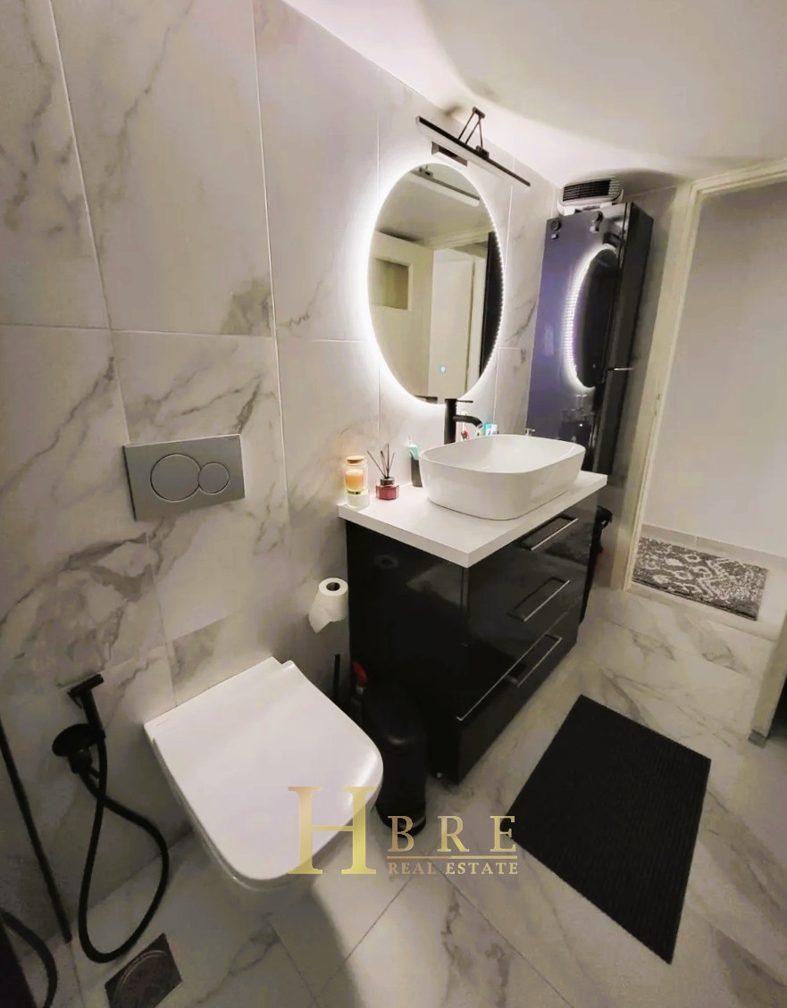 The property consists of a bright living room with a modern open-plan kitchen, a hallway with a built-in library, 2 bedrooms with wardrobes, 1 bathroom, and a loft offering additional storage space. The renovation included the complete replacement of all plumbing and electrical installations, ensuring modern standards of comfort and safety.