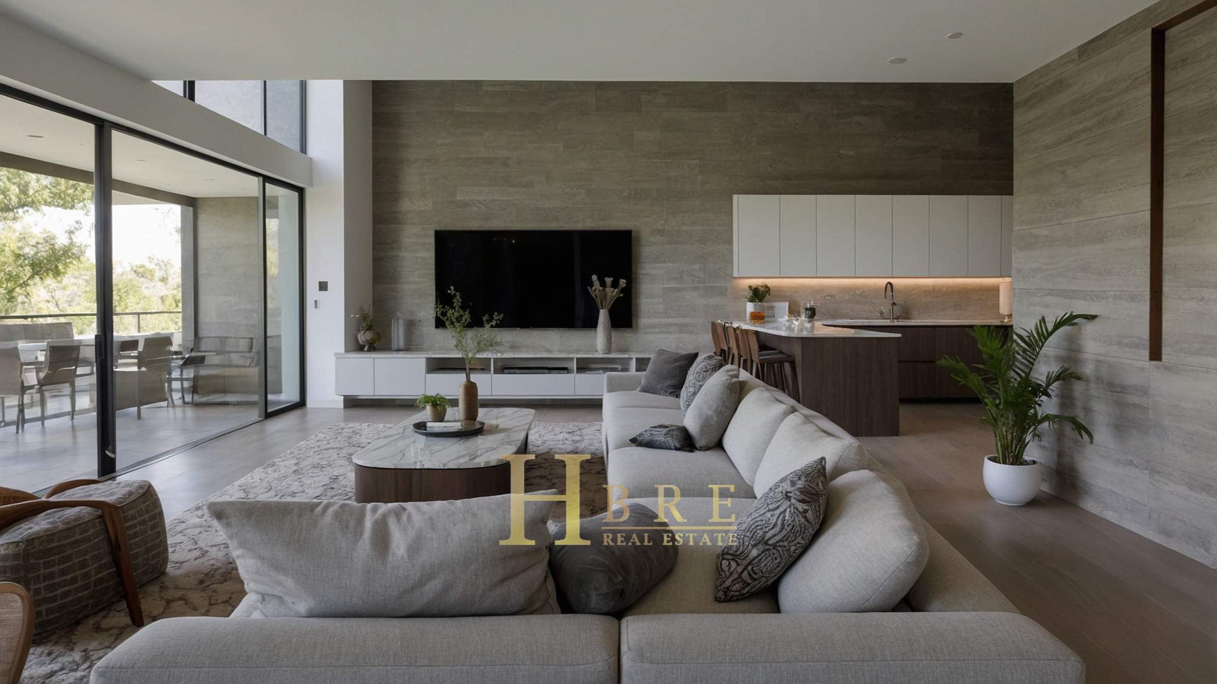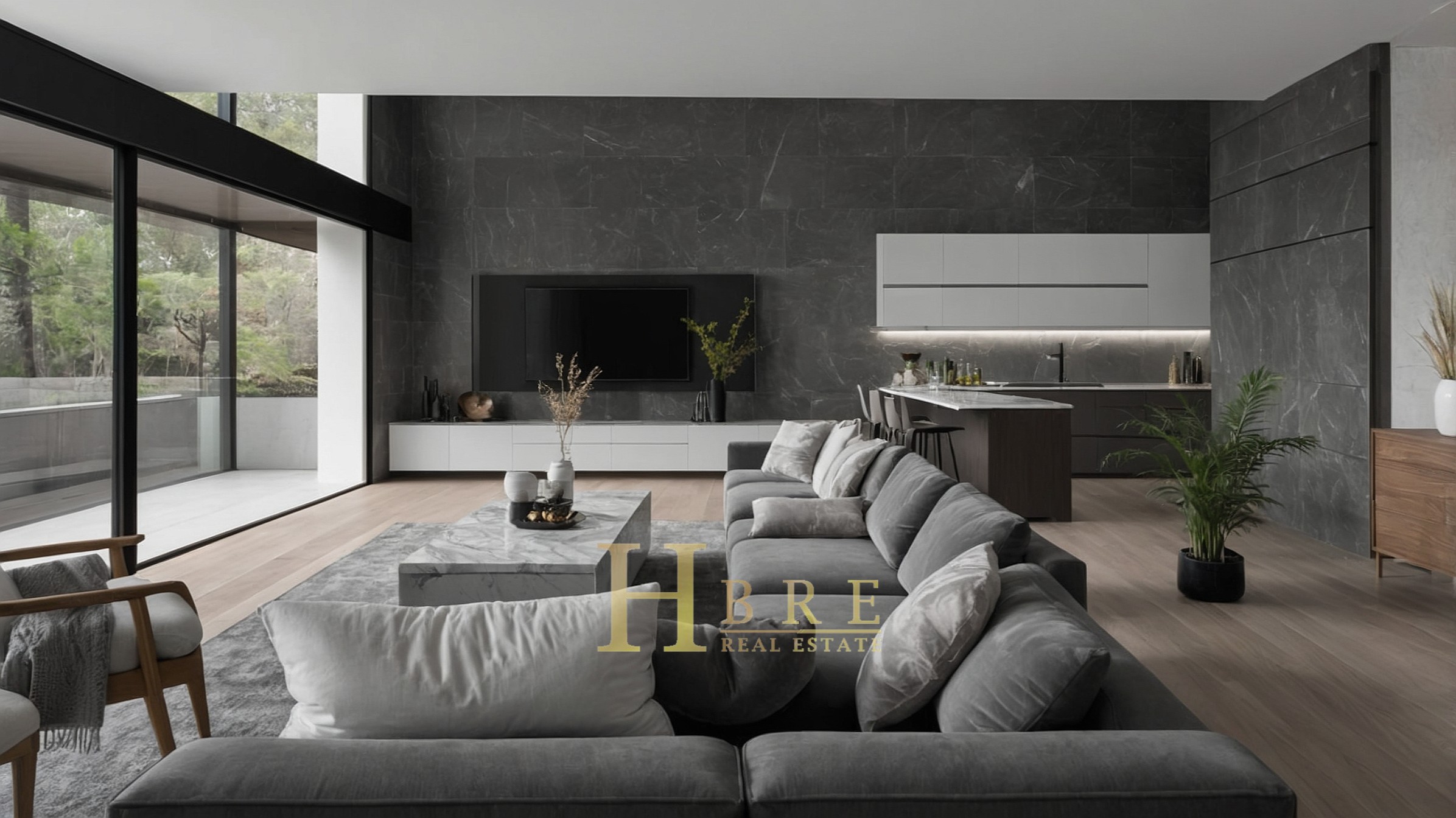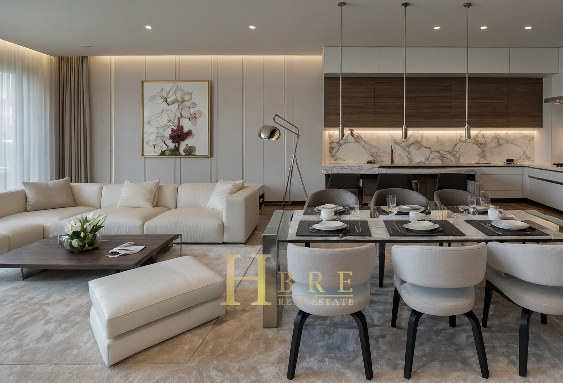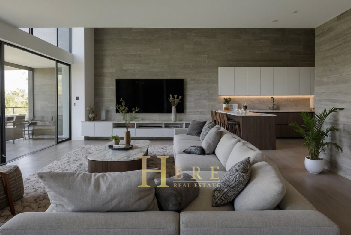 The open-plan living and dining area connects seamlessly with the modern kitchen, creating an elegant and practical everyday living environment. Large floor-to-ceiling windows allow abundant natural light to flow in, while the elevated position offers open views, enhancing the sense of privacy and freedom.